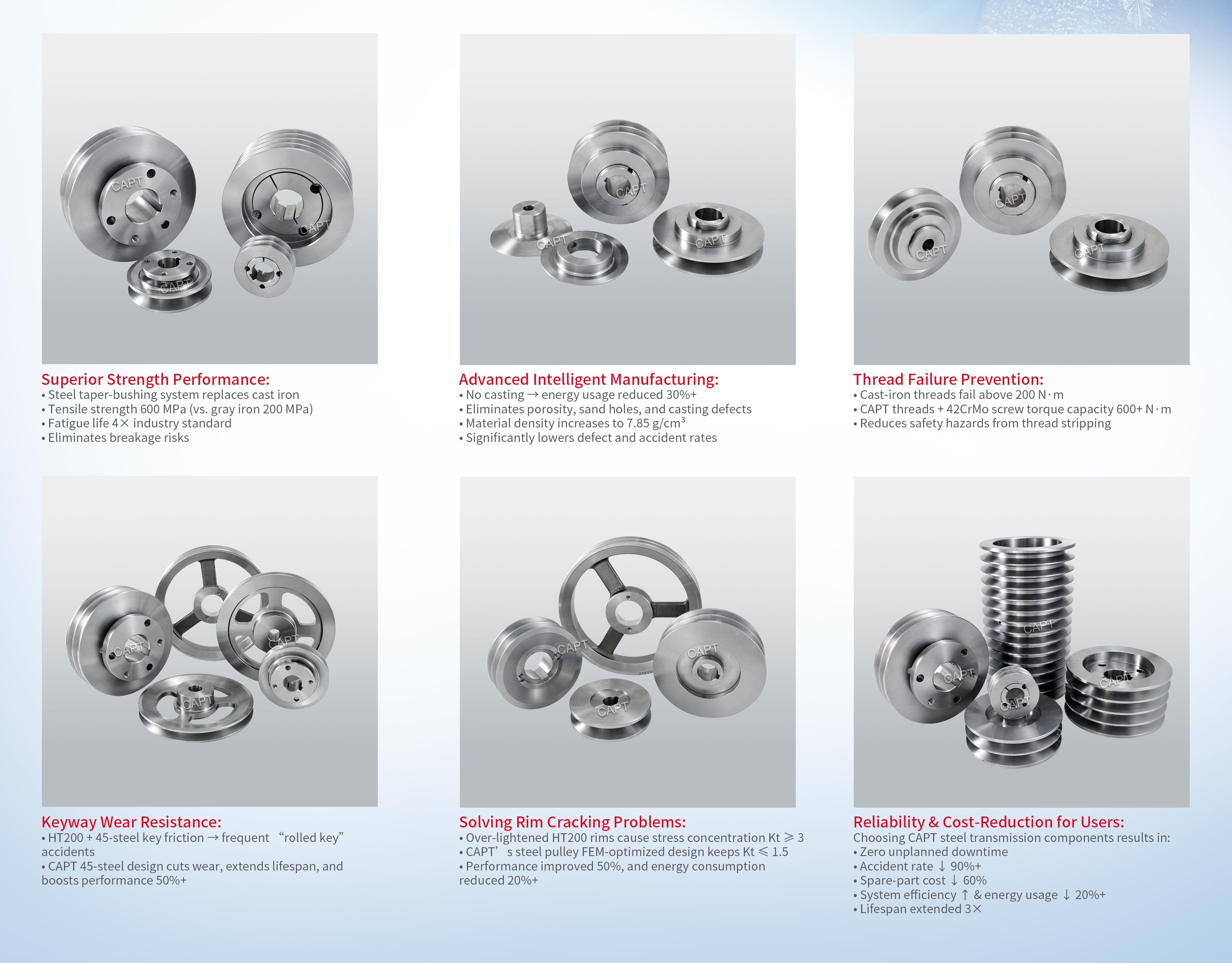 The New Industrial Standard for Small-Diameter Drive Pulleys (<200 mm). Steel drive pulleys under 200 mm are becoming the preferred replacement for traditional cast-iron pulleys due to their exceptional mechanical performance. Using advanced material science and precision production, CAPT delivers a complete solution for modern industrial transmission needs.
